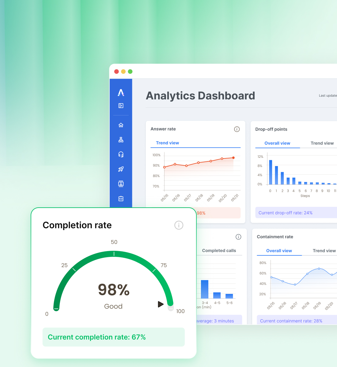 Identify behavior patterns, drop-off points, and engagement trends to refine conversation design and improve completion rates.